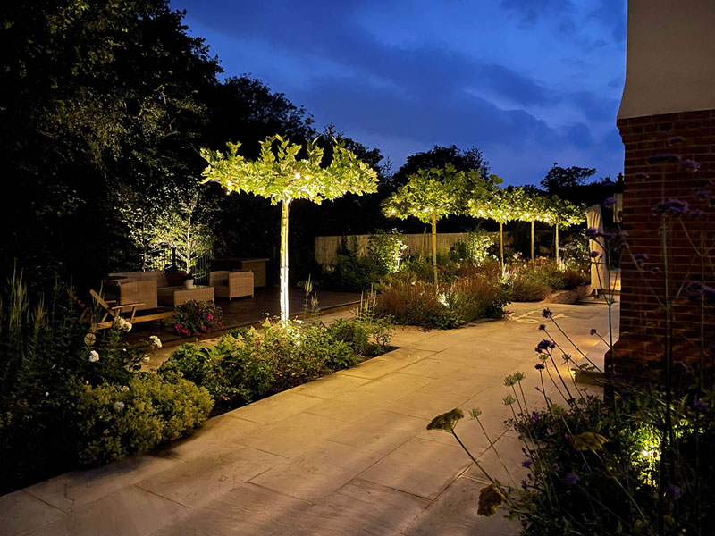 Our client's garden is surrounded by a woodland of mature trees - oaks, sycamore and ash - that they also own. It seemed such a shame that the woods were separate from their outside space so we took down the fences and built a cantilevered deck, out into the air. This is bordered with a bespoke metal balustrade, with waved tops to reflect the shape of the surrounding trees and painted dark green. This has hugely increased the size of the garden. We also built a new patio with an outdoor kitchen and separated off the other end of the garden with a summerhouse. This summerhouse garden has a small boardwalk and a water feature, creating a completely different seating area. Seating and a woodburning stove means the summerhouse can be used all year, and another section has been furnished as a gym. Despite being set in woodland, we brought in a large number of ornamental trees to add blossom and autumn colour to the indigenous woodland specimens.