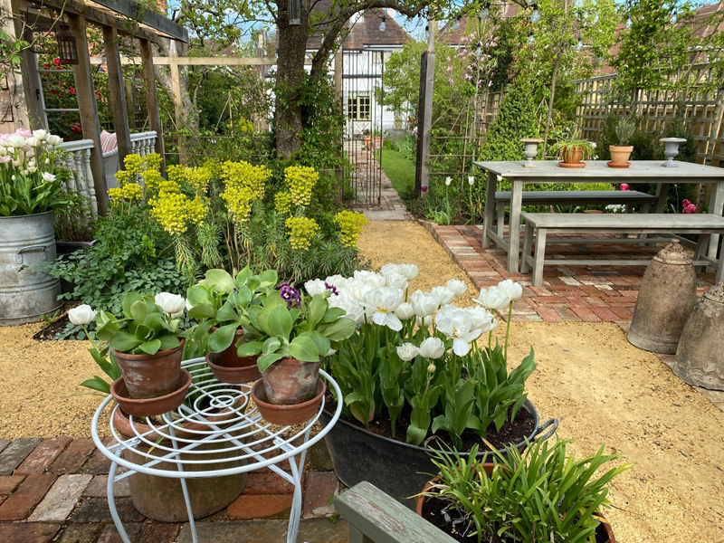 Nowadays our gardens are more like houses, with attention to detail and outdoor furnishings. Even the smallest garden can be an oasis. If you see something you like in a reclamation yard, then buy it. It will never be a bad decision, even if you're not sure where it's going. Fob off your partner by pretending you know exactly where you're putting it! I go for rusted gates and metal screens, large pots and urns, and old French windows. Keep pots simple for groupings. You can't beat old terracotta or something galvanised. If you're more of a contemporary gardener, then these materials still work and create an interesting juxtaposition to your modern decor, but choose simple, single colour pots and buy as large as you can afford. Apart from your borders, add seasonal planted pots: Daffodils, tulips and groups of Auriculas in Spring. Lavender, white and grey bedding in Summer, Cyclamen, Ivy and Pansies in winter.